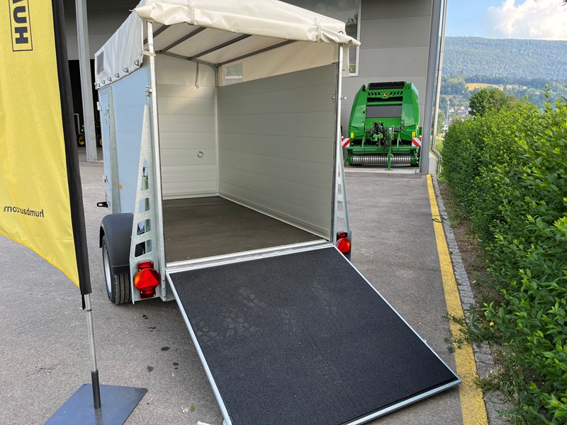 Der neue Einachs-Tieranhänger besticht durch seine robuste Bauweise aus doppelwandigen, eloxierten Aluminiumprofilen. Das feuerverzinkte Fahrgestell sorgt für hohe Stabilität und optimale Sicherheit. Der verklebte und versiegelte Gummiboden gewährleistet einen sicheren Stand während der Fahrt. Eine große Einstiegstür befindet sich auf der linken Seite des Anhängers, der außerdem mit einer Plane und einem stabilen Gestell ausgestattet ist.